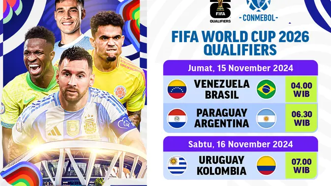Jangan lupa saksikan pertandingan dan para aksi pemain dari tim-tim bagian Amerika Selatan di CONMEBOL Qualifiers 2026. Berikut adalah jadwal live streaming pertandingan FIFA World Cup Qualifiers 2026 – CONMEBOL pada matchday ke 11 di pekan ini.